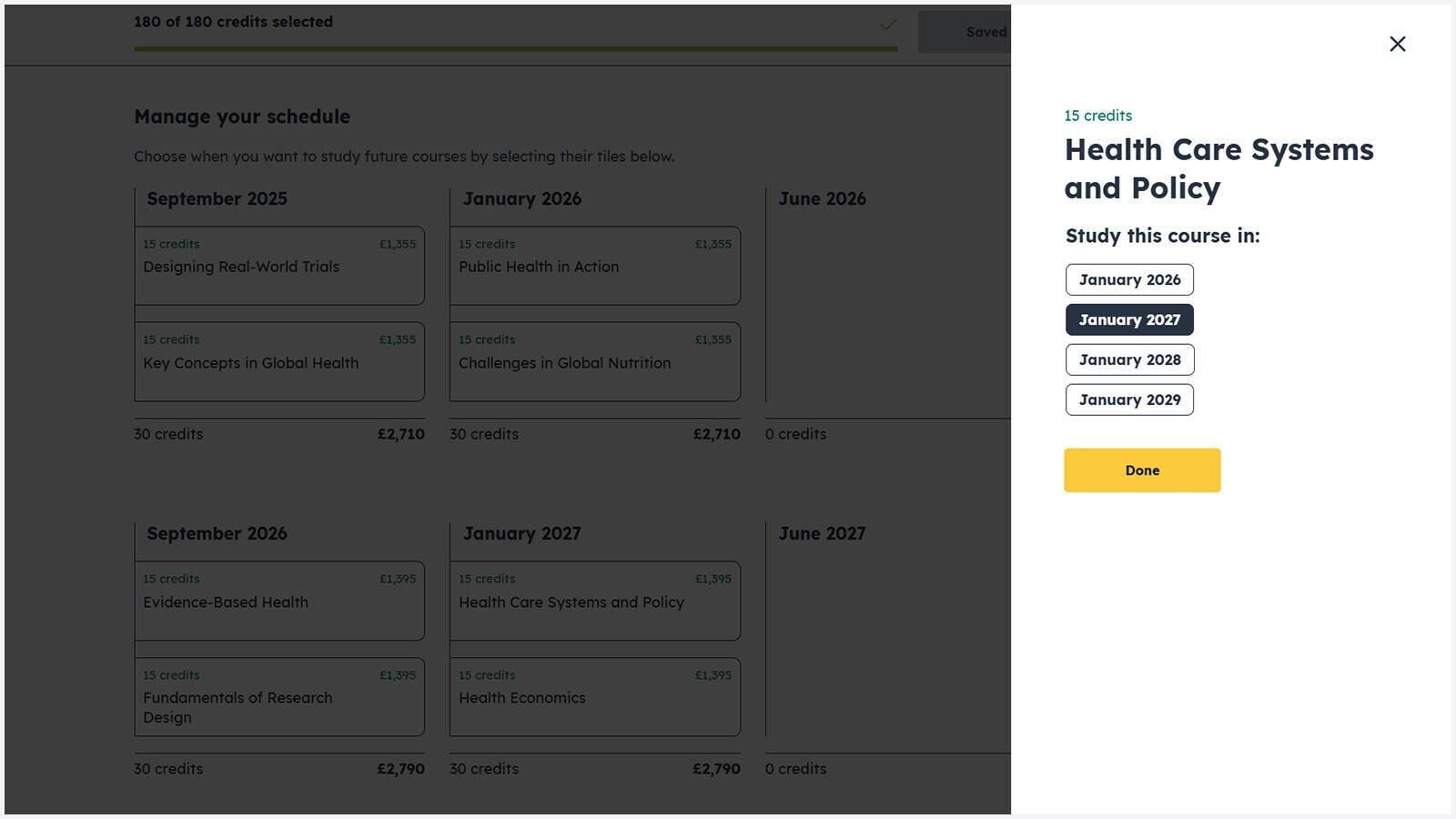 Customise your schedule by clicking each course and selecting the term in which you’d like to study it. Click ‘Done’ to confirm your choice.