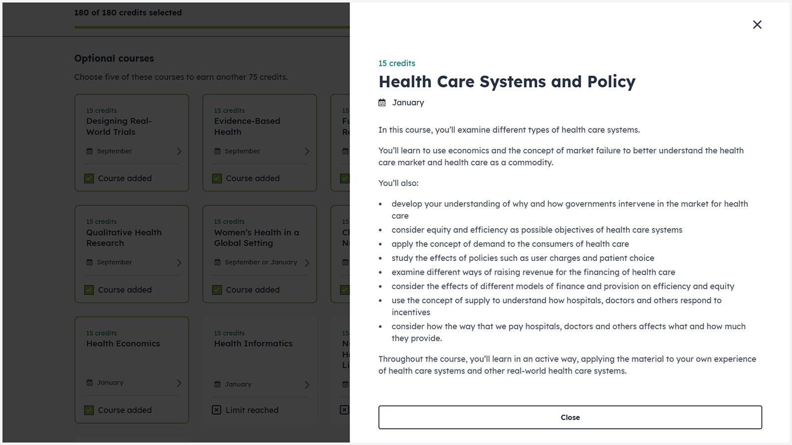 You need to select enough courses to make up the credits required for your qualification. The progress bar at the top of this section shows the number of credits you’ve selected.