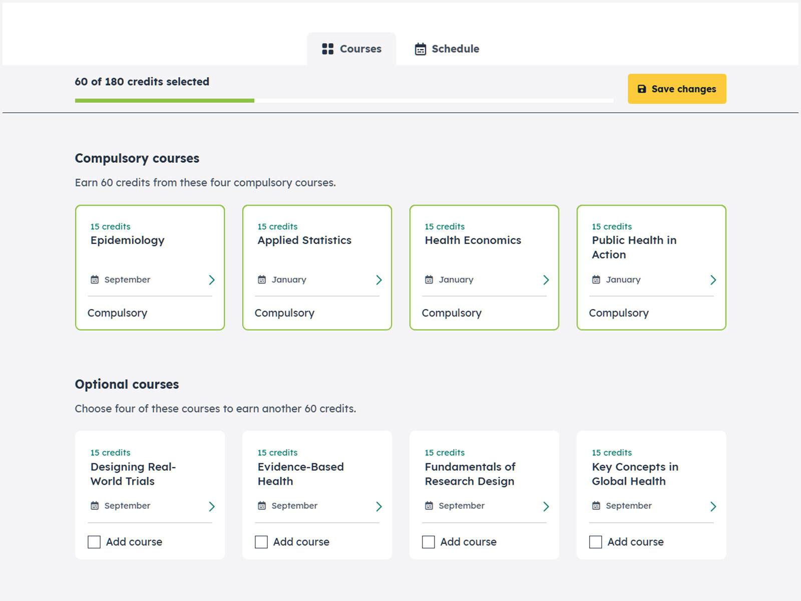 At the bottom of each term in your schedule, you’ll see the total number of credits and total cost of courses that you have selected for each term. This allows you to see your per-term workload and study costs at a glance.