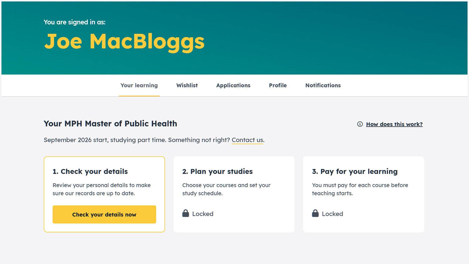 The ‘Your learning’ page will guide you through the registration process in three steps. Completing each step will unlock the next.